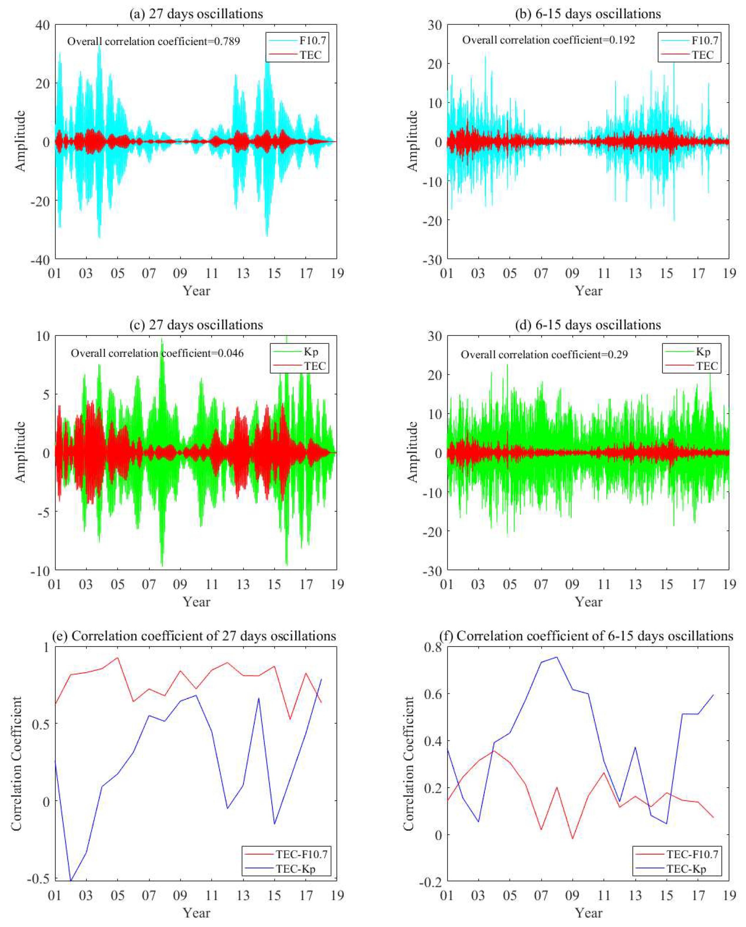 - The ionospheric oscillations with periods shorter than 20 days correlate better with the Kp index. This type of ionospheric oscillation occurs mostly at the minimum solar stage. And the correlation coefficient between the Kp index and TEC also has a significant increase at the minimum solar stage. This indicates that these ionospheric oscillations are most likely caused by coronal hole high-speed streams and CIRs.
