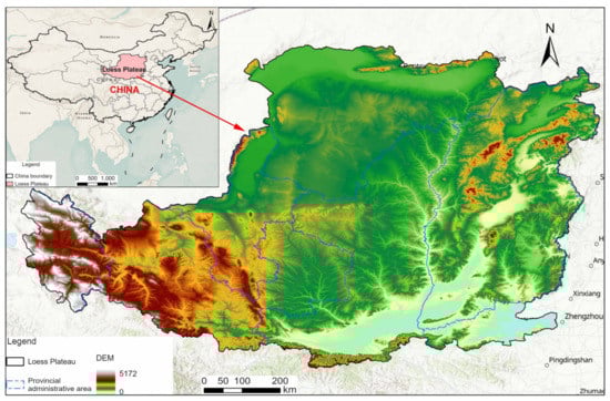 The Loess plateau, located in the middle reaches of the Yellow River (Figure 1), northern China (33.68–41.29N, 100.86–114.53E), is one of the four major plateaus in China and also the largest loess deposit region in the world. The total area of the LPC is 6.32 × 105 km2, approximately 6.6% of the total land area of China. Its geographical boundary extends to the Taihang Mountains in the east, Riyue Mountain and Wushao Mountain in the west, and Qinling Mountain in the south, covering parts of Qinghai, Gansu, Ningxia, Inner Mongolia, Shaanxi, Shanxi, and Henan provinces [33]. The LPC belongs to the transition zone of the humid monsoon climate to the inland arid climate, from southeast to northwest climate in the order of semihumid, semiarid, and arid climate. Controlled by the temperate continental climate, the seasonal differences in temperature and precipitation are distinct, and the average annual rainfall in the region ranges from 200 to 700 mm [34]. Affected by its geographical location and climate, the LPC has become the most serious area of soil erosion in China, even in the world, and has received extensive attention from ecological and geographical studies. Presently, a series of ecological problems such as soil erosion and desertification have placed additional burdens on the ecologically fragile LPC [35]. Related studies have shown that the average annual soil erosion rate was 3180 t km−2 yr−1 from 2000 to 2008 [36]. Meanwhile, with the continuous expansion of cultivated land and urban construction land area in this region [37], the ecological land area is generally in the trend of reduction, exposing the ecological environment of the region to risks.