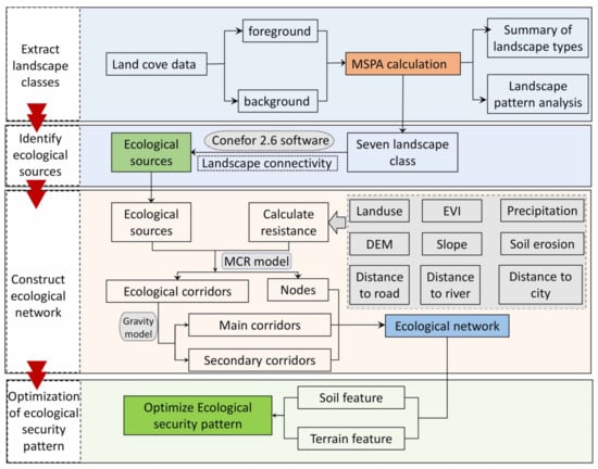 The workflow of this research is shown in Figure 2, and four steps are taken. The first step is to extract landscape classes in LPC using the morphological spatial pattern analysis (MSPA) approach, followed by ecological sources identification based on landscape connectivity evaluation. The third step is constructing the ecological network with the ecological corridors and nodes extracted by the MCR and gravity models. The last step is to optimize the ecological spatial security pattern based on the land-use data.