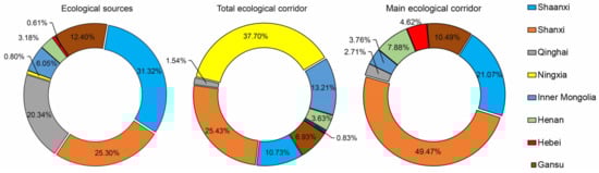 Quantifying the regional variability of ecological sources shows that 31.32% of the ecological sources are located in Shaanxi province, followed by Shanxi province (25.30%), and the area of these two central regions is 37,317.31 km2, accounting for 56.62% of the total ecological source area (Figure 7). In contrast, less than 5% of the ecological source area is located in Ningxia, Henan, and Hebei provinces. Regarding the ecological corridor, 37.70% of the total corridors are located in Ningxia province, followed by Shanxi province (25.44%). The length of these two central regions is 5442.77 km2, accounting for 63.14% of the total corridor length. Despite having the longest ecological corridors in Ningxia province, they are all secondary ecological corridors. Important ecological corridors are mainly located in Shanxi (49.47%) and Shaanxi (21.08%) provinces, reaching 70.58%, with a length of 1659.38 km. It is clearly observed that the density of ecological nodes and corridors is much higher in the southeast than in the northeast, with a significant imbalance. Moreover, severe soil erosion and low vegetation cover in the northwest cause the energy flow, material exchange, and species migration between ecological sources in the eastern area to be relatively limited. Therefore, there is an urgent need to optimize the regional space based on the current ecological corridor network and enhance the connectivity of ecological resources in these regional spaces.