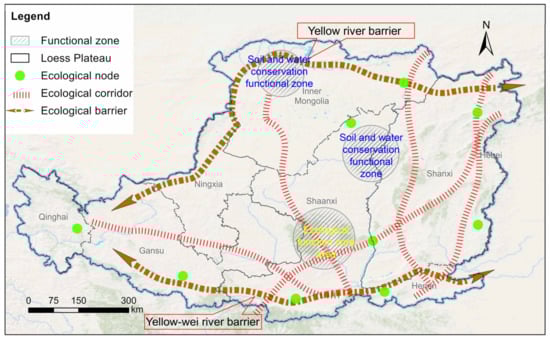 As an important reference for regional ecological management, regional ESP can guide regional ecological restoration and serve as an important basis for overall urban planning and various special plans. This study comprehensively considers the ecological sources, corridors, and ecological nodes of the LPC, attaches importance to the connection function of ecological corridors to ecological sources, strengthens the strategic transfer function of ecological nodes, and builds a “two barriers, five corridors, three zones and multipoint” ESP (Figure 8). This pattern contains a multilevel, networked, and functionally complementary ecological spatial structure to maximize the ecological effects of the accumulation, association, and diffusion of ecological resources in different regions. Among them, ‘two barriers’ refer to the Yellow River barrier in the northern part and the Yellow-wei River barrier in the southern region; these two barriers are based on the existing rivers and form a relatively enclosed area to maintain ecological balance. The two natural barriers block the radiation of external ecological influences, whilst the rivers, as important water sources, also positively impact the circulation of materials and energy flows in the surrounding area. The “five corridors” are constructed concerning the spatial distribution of corridors extracted from the MCR model and consist of four north–south and one east–west corridor. These corridors are essential axes linking the different functional subregions. The staggered spatial distribution ensures the continuity of energy flow and material exchange while complementing and continuing the ecological functions of ecological nodes and improving the connectivity of the ecological pattern. The “three zones” include two soil and water conservation functional zones (according to the soil erosion intensity), which suffer from loose soils, abundant rainfall, sparse surface vegetation, and are prone to erosion, and the ecological function core zone in the central part of the LPC. These three areas are targeted and focused for the protection of vulnerable regions. “Multipoint” are mostly identified ecological nodes. These ecological nodes are constructed to enhance the connectivity of species transfer and energy circulation paths. Compared with the original ecological landscape pattern, the optimized ESP was significantly improved in network closure, line–point rate, and connectivity rate.