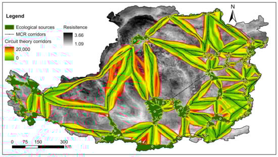 The ecological corridor constructed in this study based on the MCR model is the optimal pathway for species migration and energy flow under ideal conditions. However, species and energy may not follow an artificially defined pathway in the actual situation and may even wander randomly. In this case, the effectiveness of the ecological corridors identified by the MCR model is greatly diminished. The functional evaluation of networks based on circuit theory is a good supplement to existing models [21]. The theory treats the generated ecological resistance surface as a resistive and analyses the possible migration routes of species dispersal along a given distance (truncate distance) throughout the ecological process by modeling the movement of electric currents across the resistive surface [60]. Comparing the species-dispersal probability under circuit theory and the minimum-cost pathway (Figure 9) under the MCR model reveals that, unlike the MCR model, which provides an optimal solution from ecological source site to site, the circuit theory model offers more possible pathways for species migration and energy flow. Therefore, a more comprehensive framework for a regional ecological safety network containing point–line–multiline–surface could be constructed by combining the MCR model with the circuit theory model in subsequent studies.