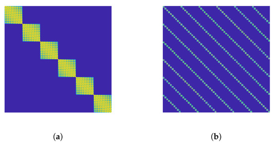 Since if , the diagonal sub-matrix is the same as the single-node clutter covariance matrix. On the other hand, since the distance between adjacent distributed nodes far exceeds the carrier wavelength , is modulated with a high spatial frequency along the azimuth if . Since the clutter is continuously distributed over the entire angular space, can be regarded as a complex random variable of a constant modulus whose phase is uniformly distributed between 0 and 2 pi. According to the stationary phase principle, even if the phase of is well-aligned at a specific index, the near-random modulation from would also prevent the in-phase accumulation of clutter energy, leading to a decorrelation of clutter components among different distributed nodes. Therefore, has an approximate block-diagonal structure, whose off-diagonal sub-matrices . Since all receiving nodes are equipped with the same linear array in this paper, the diagonal sub-matrix is a block Toeplitz matrix. A typical clutter covariance matrix (CCM) of airborne distributed radar is shown in Figure 2a.
