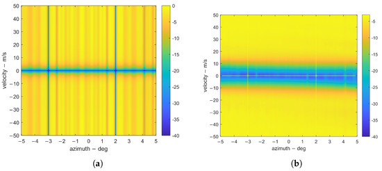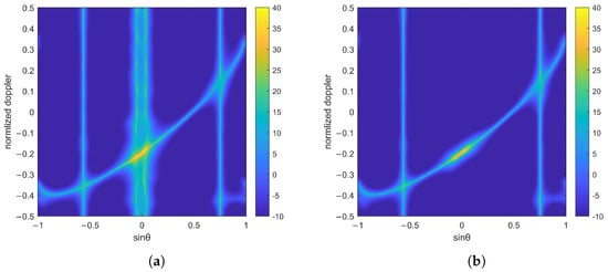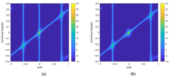 Similar to Scenario A, Figure 10 shows the capon spectrum of the first node’s training data before and after mainlobe jamming separation. Since the velocity of each radar node is no longer parallel to the array, the clutter spectrum has apparent curvature in the space Doppler plain. Compared with Figure 5, it can be found that the two instances of mainlobe jamming have evident interaction, and their spectrum also has a curvature along the Doppler axis.