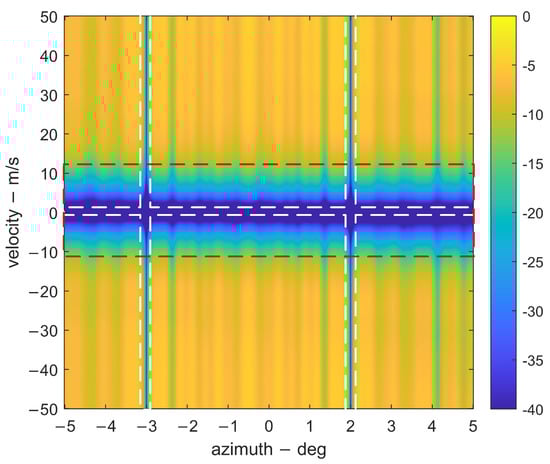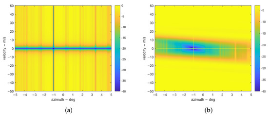 The above elimination is based on the zero-space projection of the clutter covariance matrix. In practical applications, the zero-space matrix is unknown during processing. When solving (25) and (30), it needs to be replaced with the near-zero-space of a prior CCM . Since the space–time distribution of clutter is strongly correlated with the observation geometry, a with low accuracy can be obtained from the range, radar speed, yaw angle, and other information. Since (19) needs the premise that can sufficiently suppress the clutter components, it is necessary to widen the Doppler band of the CCM obtained from the geometry information to ensure that the actual clutter falls within the suppression range, which can be realized with windowing, i.e.,