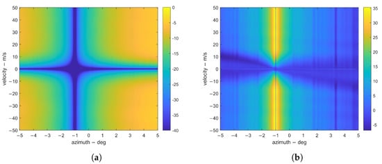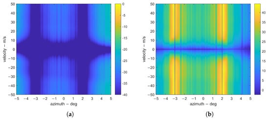 Comparison of target SNR losses with and without joint processing at different azimuths (x-axis) and radial velocities (y-axis) in Scenario B. (a) The SNR loss without joint processing. (b) The SNR gain from joint processing.