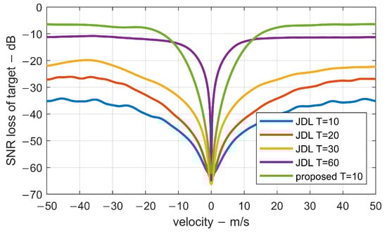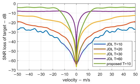 All receivers used the estimated covariance matrix after mainlobe jamming separation to calculate the beamforming matrix for the normal direction. The range of target angle between y-axis was [−5 deg, 5 deg] and the speed of target was [−50 m/s, 50 m/s]. The target velocity vector always pointed to the origin. A total of 1000 Monte Carlo simulations were performed for targets with different directions and speeds, and the average SNR loss after inter-node mainlobe jamming suppression is shown in Figure 6.