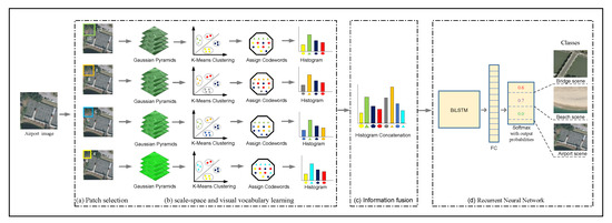 Information fusion is the process of combining multiple pieces of information to provide more consistent, accurate, and useful information than a single piece of information. In general, it is divided into four categories: decision level, scale level, feature level, and pixel-level [59]. Among them, feature-level fusion has comparatively a shorter history but is an emerging topic in remote sensing domain. The spatial relation between the proposed regions can improve scene classification in two aspects. First, aggregating the information of a neighborhood and its adjacent neighborhoods assists in recognizing the features that accurately represent the scene type of the image. For instance, determining whether farmland belongs to a forest field or a meadow requires information about its neighboring area. Second, the natural relationship of the spatial distribution pattern of a scene helps us to infer the scene category. An industrial area, for instance, is likely planar, and the runway is always linear. Therefore, we select to combine four different regions based on multiscale features, with the aim to obtain more informative and relevant features to represent the input image. Each input image I produced four sets of a histogram of visual words, which are generated by different pixel strides through the k-means clustering process as previously mentioned and denoted as , , , and . Specifically, the first set of histogram of visual words extracted from the image is ; represents the z-dimensional vector. The second set is represented as ; represents the w-dimensional vector. and are the outputs of two different patch sizes. Similarly, the third and fourth sets are represented as ; represents the y-dimensional vector, and ; represents the u-dimensional vector, respectively. Information fusion is performed by the concatenation of ,, and , and the result is denoted by , which corresponds to an -dimensional vector. Thus, the fusion operation is achieved by the following formula: