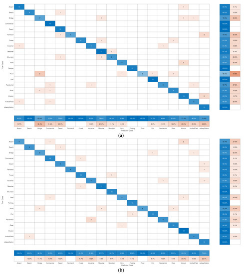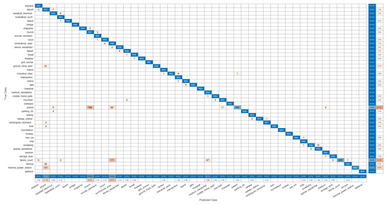 NWPU-RESISC45 Dataset: It consists of 31,500 remote sensing images divided into 45 scene classes, covering more than 100 countries and regions all over the world [61]. Each class contains 700 images with the size of pixels. This dataset is acquired from Google Earth (Google Inc., Mountain View, CA, USA), where the spatial resolution varies from 30 to 0.2 m per pixel. This is one of the largest datasets of remote sensing images and is 15 times larger than the most widely-used UC Merced dataset. Hence, the rich image variations, high inter-class similarity, and the large scale make the dataset even more challenging.