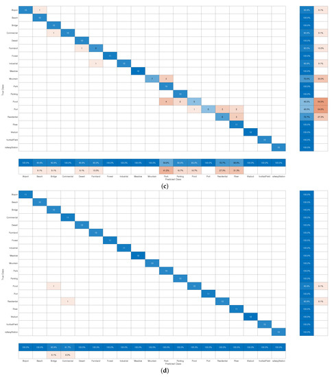 Confusion matrix of our proposed method on WHU-RS dataset by fixing the training ratio as training (a) with one-stage learning, (b) with two-stage learning, (c) with three-stage learning, and (d) with multi-stage learning. Zoom in for a better view.