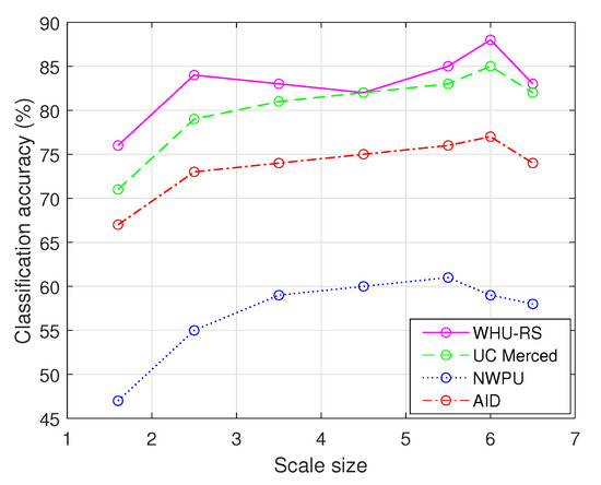 Figure 7 shows the classification performance of each scaled image based on neighborhood size. The PBDL extracts multi-scale dense features according to the scale factor to control the Gaussian kernel. It can be observed that with the increase of scale factor, the performance first improves and then gradually decreases after the scaled image. We conclude that including a certain range of Gaussian smoothed images can improve the performance, but too many of them not only reduce details but also degrade the performance.