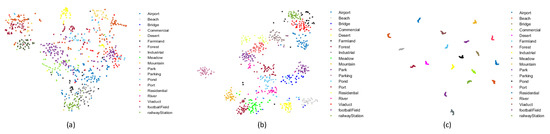 One of the advantages of the proposed approach is that we can interpret the classification process of the model. Especially for each stage, we can see how the features are structured into the data space as well as their impact with respect to the different classification stages. Taking this into consideration, we employed the “t-distributed stochastic neighboring embedding” (t-SNE) algorithm [63] and illustrated the derived embeddings into three separated processing stages: (1) one-stage learning, (2) combined learning (PBDL), and (3) BiLSTM classified features for the WHU dataset. The features with the patch size of in Figure 10a show that the most classes are strongly correlated, which makes the classifier (BiLSTM) hard to separate them. We also visualize the clusters by fusing all the neighborhood features in Figure 10b. The derived clusters indicate that the proposed fusion reduces the correlation between similar classes and can capture more variability in the feature space. Moreover, it could be noticed from Figure 10c that all the classes are well separable which could potentially lead to a better performance when training BiLSTM on remote sensing dataset.