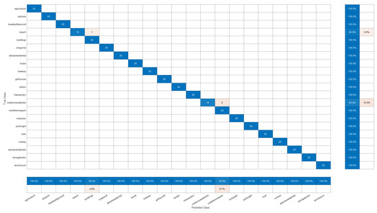 WHU-RS Dataset: It was collected from satellite images of Google Earth [60]. This dataset consists of 950 scene images and 19 classes with a size of . Each image varies greatly in high resolution, scale, and orientation, which makes it more complicated than the UCM dataset.