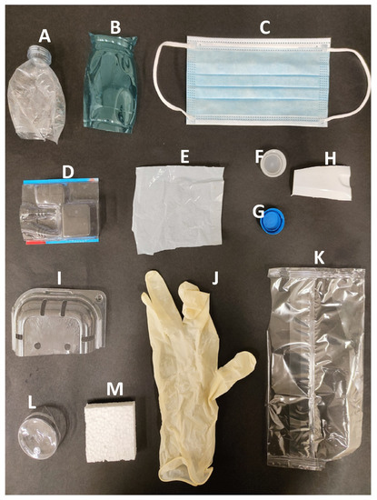 Figure 1 shows the samples selected for the fluorescence LIDAR measurements. All the samples selected for the experiment were parts of commercially available items. All the samples were taken from weathered items, used for several years (>2 years), except for the surgical mask that was not used. The list of the samples, together with a short description and the material they are made of (when the information was available), are reported in Table 1.