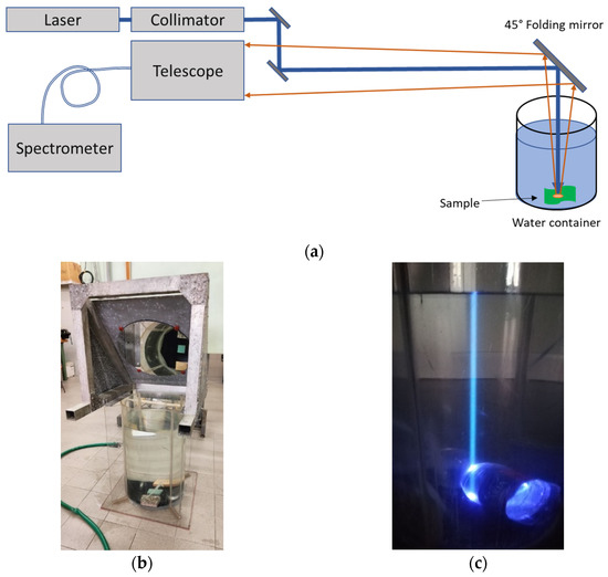 Experimental set-up in the laboratory for the fluorescence LIDAR experiments: (a) block diagram of the experimental set-up, (b) detail of the 45° mirror and the container filled with water, and (c) photo of the laser-induced fluorescence emitted from dissolved organic matter present in the water column and from the plastic bottle when hit by the laser beam.