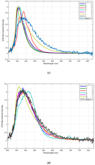 Figure 3 shows the fluorescence spectra of the dry samples: the spectra were acquired with excitation wavelength at 355 nm, from a distance of 11 m and in ambient light. Each fluorescence spectrum was obtained as an average over 10 laser shots. Figure 3a,b show the fluorescence spectra of samples in relative units, including the fluorescence spectrum of the black foil (Black F) used as a background at the bottom of the container and whose fluorescence emission is negligible with respect to the one of the examined samples. Figure 3c,d show the fluorescence spectra of the same samples, normalized to their standard deviation in order to make easier the comparison of their spectral shapes. All samples showed a detectable fluorescence emission with a maximum between 410 nm and 450 nm, except for sample G (HDPE, blue bottle cap) that had a fluorescence maximum emission at longer wavelength (470 nm, approximately) and sample J (latex, surgical glove) that had a maximum at 395 nm. All PET samples (A, B, H, I, L samples) featured a very intense fluorescence band with a maximum at 410–420 nm (Figure 3a). Only sample B (blue-colored PET bottle) had a slightly less intense fluorescence spectrum (Figure 3a), although its spectral shape is definitely similar to that of all other PET samples (Figure 3c). In Figure 3c, it can be also noted that the fluorescence spectrum of the white PET bottle (sample H) has its maximum at 420 nm, slightly shifted with respect to the one of the other PET samples. In addition to the PET samples, PVC blister (sample D) and the latex glove (sample J) also showed an intense fluorescence characterized by a peculiar spectral shape due to several fluorescence contributions (red and light green lines in Figure 3a). HDPE bottle caps, the chirurgical mask and the white plastic bag sample (samples F, G, C and E in Figure 3b, respectively) are fluorescent, yet definitely to a lesser extent. It is to be noted that all samples containing PET plastics (A, B, H, I, L samples) have an intense, relatively narrow fluorescence band centered at about 410–420 nm and 50 nm wide; all the other commercial samples show fluorescence spectra with several contributions between 400 nm and 600 nm. Among the less fluorescent samples (Figure 3d), the used white plastic bag (unknown material) showed a spectral shape very similar to that of sample K (transparent packaging in polypropylene) and of the low-fluorescent black foil used as a background (black alveolar sheet in polypropylene). Fluorescence intensity is of course affected by additives and dyes mixed with the polymer, yet the main features of the spectral shape remain unchanged.