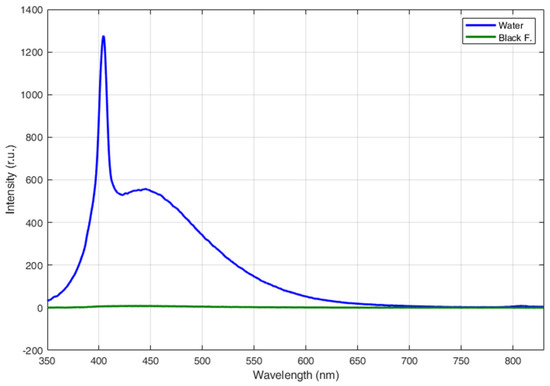 Figure 4 shows the fluorescence LIDAR spectrum obtained on the water column of the container with the only black low-fluorescent sheet on the bottom. In the same graph, we also reported the fluorescence LIDAR spectrum of the black sheet (background) placed at the bottom of the container, whose fluorescence contribution is, in fact, negligible (green line in Figure 4). The spectrum of the water clearly shows a considerable fluorescence contribution due to CDOM with a maximum at about 440 nm. Moreover, the spectrum shows the typical Raman scattering signal at 404 nm due to the OH-stretching of the water molecules. This is the typical fluorescence LIDAR spectrum that can be expected by measurements acquired in coastal waters with a significant CDOM fluorescence contribution [59].
