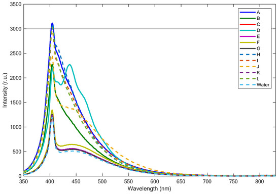 Figure 5 shows all the fluorescence LIDAR spectra acquired on the different samples of plastics (sample A through L) when these were plunged into the 50 cm water column. For the sake of clarity, the fluorescence LIDAR spectrum of the correspondent water column (without plastics) is also reported in Figure 5 (cyan dashed line). All spectra had the contribution due to the water Raman signal centered at 404 nm, although the latter is definitely less apparent in the spectra obtained on the strongly fluorescent PET samples. In general, all strongly fluorescent plastic samples (samples A, B, D, H, I, J, L) showed a fluorescence contribution that can be easily detected as a major, abrupt change in the fluorescence intensity of the spectrum, especially in the 410–470 nm spectral range. On the other hand, the less fluorescent samples (samples C, E, F, G, K) show a fluorescence contribution of plastics that can be hardly decoupled from that due to the CDOM present in the water column.