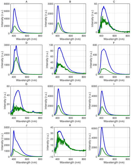 Corrected fluorescence spectra retrieved from the spectra acquired on the wet samples (green lines) and the corresponding spectra acquired on the dry samples (blue lines): (A) transparent PET bottle, (B) blue PET bottle, (C) surgical mask, (D) transparent blister, (E) white plastic bag, (F) white bottle cap, (G) blue bottle cap, (H) white bottle, (I) fresh fruit container, (J) latex glove, (K) transparent packaging, (L) transparent plastic glass.