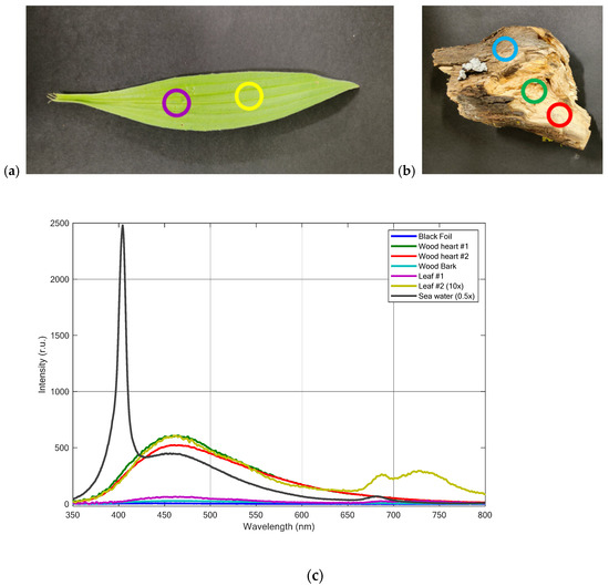 Fluorescence LIDAR spectra of the other materials that can be typically found as marine debris: (a) leaf, (b) wood log, and (c) relevant fluorescence spectra (wood heart, wood bark, leaf) together with a typical fluorescence spectrum of (mesotrophic) sea waters. For the sake of clarity, one spectrum acquired on the leaf was multiplied by a 10 factor (in order to see the chlorophyll fluorescence spectral shape) and sea water spectrum by a 0.5 factor (in order to see the Raman signal). The locations where the fluorescence measurements were acquired are marked in (a,b) with circles of the same color of the spectra in (c).