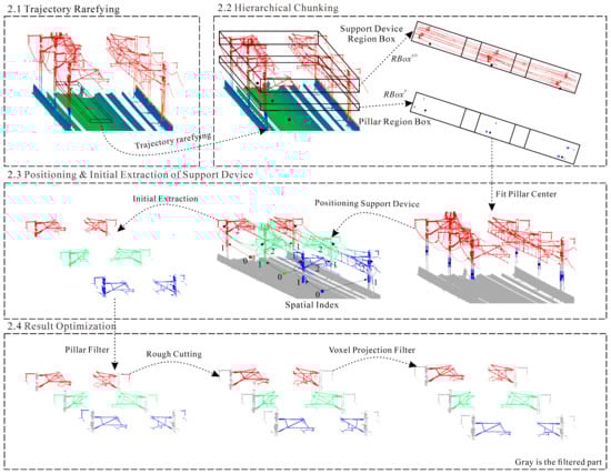 Using the MLS point cloud, the proposed method can extract the support devices automatically and accurately using a gradual processing scheme, including the scene hierarchical chunking, positioning and initial extraction of the support device, and result optimization process. All these steps make a difference in the proposed method’s high extraction accuracy. The algorithm flow chart is shown in Figure 2. Firstly, the original railway scene is divided into hierarchical chunking based on key trajectory points. Affine transformation is performed on the divided region blocks to facilitate batch processing of the railway scenes. Then, the support device is located through the appropriate pillar center point of the neighborhood search and the relatively stable spatial relationship between the pillar and the support device, and then the initial extraction of the support device is realized. Finally, the pillar and voxelized projection filters are integrated to filter out the pillars, suspended insulators, and contact wires in the initial extraction results, and the high-precision automatic extraction of support devices in complex railway scenes is gradually realized.