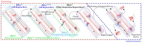 To further amplify the feature expression of the support device in the processing point clouds, the pillar device and the support device were bonded according to the relatively stable spatial topological relationship between them, and then we realized the positioning and initial extraction of the support device. Figure 4 shows the initial extraction process of the support device. The critical idea was to complete the support device’s initial extraction by constructing the support device’s initial extraction region block using the support object’s spatial location as a reference. Therefore, it was necessary to quickly and accurately extract pillar points in the pillar corridors. An algorithm was designed for the pillar center point based on a neighborhood search to extract the pillar point cloud in the pillar corridor effectively. Specifically, due to the significant distances between the pillars, we chose a random point in the pillar data corridor as a seed point to complete the construction of the neighborhood region blocks (RBoxN). Then, by analyzing the number of pillar points in RBoxN, a series of initial pillar center points (pIPC) was obtained. Furthermore, the pillar detection region block (RBoxPI) was built on pIPC because the compensation device on the pillar had similar characteristics (in terms of the number of point clouds) to the pillar in the pillar corridors. The pseudo pillar center points could then be filtered out by analyzing the characteristics of the point clouds in RBoxPI. The detailed procedure is shown in Algorithm 1.