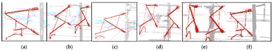 The point sparsity of small-scale targets is mainly determined by their size and the scanning point density of the laser scanning equipment. In this manuscript, the proposed method can break through the size limitation of the support device itself and achieve the fast and efficient extraction of the support devices in complex railway datasets. In addition, the core of the proposed algorithm is the relative spatial relationship between railway devices in the railway scene. Therefore, the decline of the overall point density has a limited impact on the processing performance of the algorithm. To prove this argument, we diluted the point cloud data of the original six support devices to one-fifth of the original so as to test the performance of the proposed algorithm on sparse point clouds. The test results are shown in Table 5 and Figure 19. The accuracy of the test results is more sensitive because of the sparse points, and the extraction accuracy is lower than the original data. However, after thinning by 4/5 of the data, the mean F1 and IoU of the six support devices can still achieve 97.29% and 94.75%, respectively, demonstrating that the proposed method can still complete the automatic and accurate extraction of the support device in the railway dataset. Thus, the proposed method can still realize the automatic extraction of support devices from railway data with low-density point clouds.