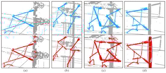 The number of support devices and the number of contact wire points in the voxel area are strongly related to the filtering effect of voxel projection, and the widths of the two ends of the flat wrist arm are noticeably different. As a result, multiple voxel area sizes were investigated in this research to determine the best voxel filtering threshold (), allowing for successful contact line filtering. At the same time, because of the vertical distribution between the contact wire and the support device, the X-axis edge () of the voxel area is longer than the Y-axis edge (d) to improve the extraction accuracy of the support device. Considering the above factors, we set the test interval to be and the d test interval to be , where is the length of the upper side of the coarse clipping area in the Y-axis direction. The test results are shown in Figure 17.