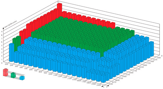 The extraction threshold () of the pillar neighborhood search and the filtering threshold () of the pillar center inspection area will significantly affect the extraction result of the pillar center. Therefore, we observed changes in the number of pillar center extraction results in the symmetric distribution scenes by adjusting the values of and (Figure 16). There were six pillars in the original scene. The number of pillar center points extracted decreased with the increase in parameters and and the number of pillar center points extracted by the algorithm matched the number of pillars in [200,1600] and in [1250,3250]. This suggests that when and are too low, the presence of compensation devices is misidentified as pillars and they not detected during inspection, resulting in more extracted results than the actual number of pillars. When and are too high, some pillars are ignored during the neighborhood search, or some correct results are filtered during checking, resulting in fewer extracted pillars than the actual number of pillars. In addition, when is too low, we can use a larger to filter the wrong results in the checking process, as shown in Figure 15. When is 100, is 4250 or 4000, and the number of extracted pillars is correct. However, considering the applicability of the railway scene, relatively average parameters are chosen as and in this paper, that is, is 900 and is 2250.