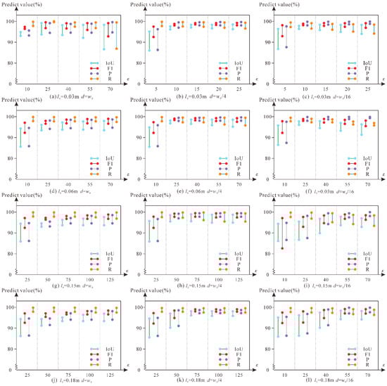 The upper end of the dumbbell seen in Figure 17 represents the highest test accuracy of the six types of support devices, while the lower end represents the lowest. When this parameter is used, the median length of the dumbbell reflects the algorithm’s stability, and the longer the length, the larger the precision fluctuation and the lower the stability. As shown in Figure 17a, with the increase in , P gradually increases and R gradually decreases and the IoU and F1 first increase and then decrease. This shows that the contact wire and part of the support device point cloud are gradually filtered out, but the filtered part of the support device can be ignored, and so the IoU and F1 gradually increase. Then, as becomes more prominent, most of the contact wires are filtered out, and the support device filter portion begins to affect the final extraction accuracy, leading to a gradual decrease in the IoU and F1. In addition, With the gradual decrease in d and , the points in the voxel region are gradually reduced and the overall stability of the algorithm is gradually improved. In summary, the values of , d, and are closely related to the final extraction effect of the algorithm.