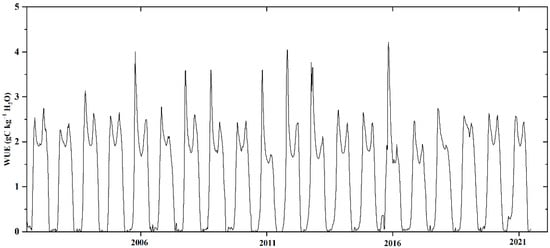 Example of WUE changes for a cropland pixel (38°11′N, 102°38′E) during 2002–2021.