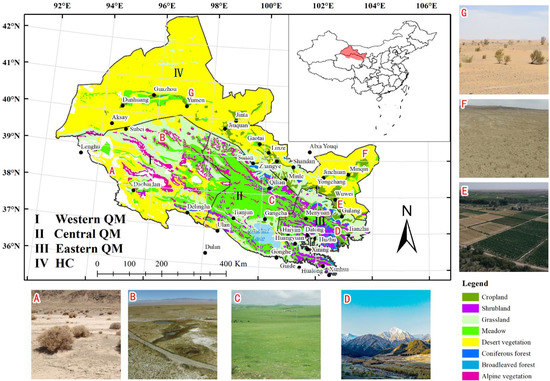The spatial extent of the study area is 93°30′–103°00′E and 35°43′–39°36′N. Located in the northeastern Tibetan Plateau, the QM is one of the alpine mountain systems in Northwest China, which runs from northwest to southeast and spans Qinghai and Gansu provinces. Most of the mountains are above 4000 m. The HC region, a narrow valley running northwest-southeast, is located in the northern Qilian Mountains, at an elevation of 1100 to 1700 m. The topography of the study area is complex, and there are significant differences in water and heat conditions, soil conditions, and vegetation cover [32]. The QM and HC regions are distinct natural geographic units connected by water resources. The QM region recharges numerous in-stream rivers, maintains the oasis and desert ecosystems in HC, and affects the local ecological environment.