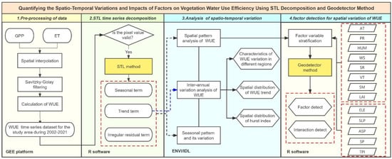 Figure 3 shows the technical scheme, including four key steps: (1) data preprocessing, (2) STL time series decomposition, (3) analysis of the spatio-temporal variations of WUE, and (4) factor detection for the spatial pattern of WUE.