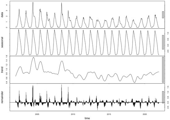 The cyclical season pattern caused by the Earth’s orbit around the Sun “carved names” on many ecological and environmental time series. This annual seasonal oscillation must first be distinguished to comprehend the time series change [21,46]. The STL decomposition method is a nonparametric statistical method proposed by [19]. It comprises two main components: an inner loop for fitting the trend and period terms and an outer loop for calculating robustness weights to reduce the effects of outliers. The basic formula was shown as follows: