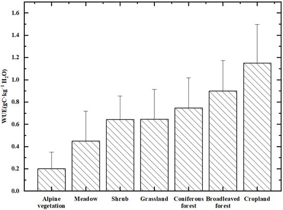 The average annual WUE was overlaid with a vegetation-type map to obtain the WUE characteristics for each vegetation type within the study area. During 2002–2021, the average WUE of the seven vegetation types ranged from 0.2 to 1.15 gC kg−1 H2O (Figure 6), with the highest WUE (1.15 gC kg−1 H2O) for cropland, followed by broadleaved and coniferous forests with 0.90 and 0.75 gC kg−1 H2O, respectively. Grassland, shrubs, meadows, and alpine vegetation followed in that order. Overall, the WUE of woodlands was significantly higher than that of shrubs and herbaceous plants, except for cropland affected by human activities.