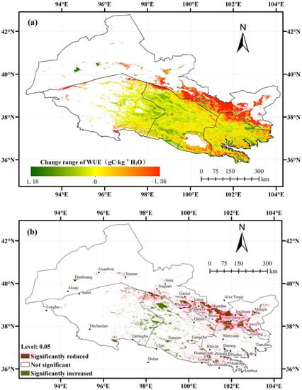 Spatial distribution of the magnitude of WUE change (a) and M-K test result (b).