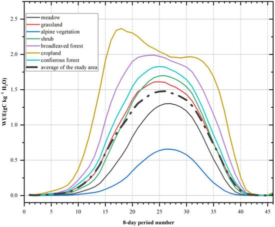 Influenced by vegetation physiological and ecological characteristics of vegetation, different vegetation types showed distinct seasonal patterns (Figure 9). The WUE of cropland showed an approximate bimodal pattern, peaking in the 18th and 31st 8-day periods, respectively. The first peak was considerably higher than the second. Other vegetation types showed a single-peaked pattern, with the peak in early July. The peak value was ranked as follows: cropland > broadleaved forest > coniferous forest > shrub > grassland > meadow > alpine vegetation.