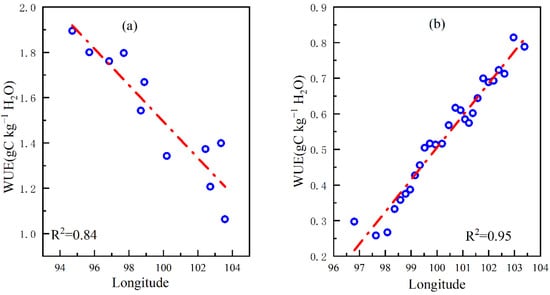 Relationship between longitude and WUE. (a) Hexi Corridor Oases, (b) Qilian Mountains.