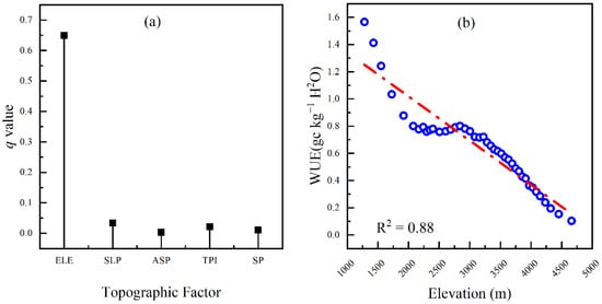 Relationships between topographic factors and WUE. (a) q values of the topographic factors, (b) the relationship between elevation and WUE. ELE: elevation; SLP: slope; ASP: aspect; SP: slope position; TPI: topographic position index.