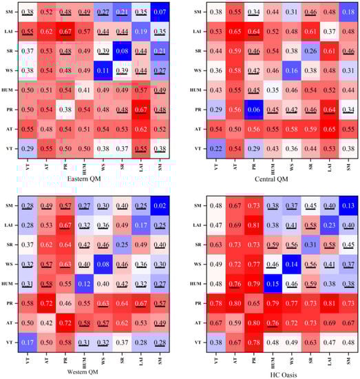 However, the explanatory power of factors for the spatial variation of WUE varied somewhat across regions (Figure 12). For example, the explanatory power of shortwave radiation varied considerably in different zones. It was 7.5% in the eastern QM, whereas as high as 30.9% in the western QM. In terms of precipitation, its explanatory power was stronger in desert regions with arid climates, such as the western QM and HC. Nevertheless, it was weaker in the relatively humid eastern and central QM (only 6.3% in the central QM). The explanatory power of LAI was close in different zones, with q values ranging from 0.169 to 0.376 and was the weakest in western QM where vegetation is sparse. The explanatory power of temperature was higher than other bio-meteorological factors. It reached over 42% in all sub-areas and even up to 59.3% in HC Oases.