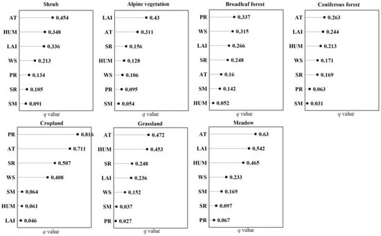 where h is the partition of a certain factor X or the dependent variable Y. Here, X represents 13 factors (AT, PR, HUM, WS, SR, VT, LAI, SM, ELE, SLP, ASP, SP, and TPI). Y refers to WUE. Nh and N are the number of units in partition h and the entire region, respectively. The and σ2 are the variances in partition h and the entire region, respectively. The q value shows the magnitude of the explanatory power of X to Y with a range of 0 to 1. The larger the q value, the stronger the explanatory power.