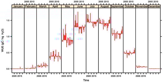 The intra-annual variation of WUE was approximately a bell curve. In November, December, and January, the WUE was low with an average of 0.025 gC kg−1 H2O due to the low temperature and inactive plant photosynthesis. From February to June, the WUE increased dramatically because of the enhanced solar radiation and suitable water and heat conditions. As the air temperature declined and plant photosynthesis reduced from July to October, vegetation growth entered the declining phase and WUE decreased significantly. Throughout the growing season (April to October), the WUE ranged from 0.23 to 1.48 gC kg−1 H2O. The highest value was recorded in the 26th 8-day period (201st to 208th day of one year).