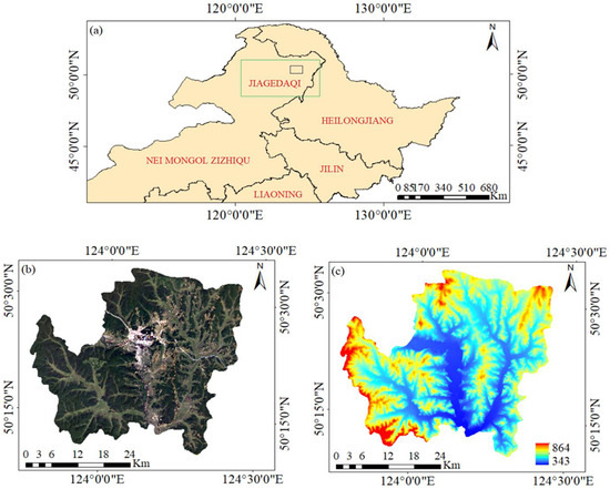 The study area of this paper is Jiagedaqi area, which is located in Oroqen Autonomous Banner of Nei Mongol Autonomous region, but administratively belongs to Greater Xing’an Mountains of Heilongjiang province, as shown in Figure 1a; the figure is the standard base map of China, from the Ministry of Natural Resources Mapping and Geographic Information website (https://zwfw.ch.mnr.gov.cn/index, accessed on 3 August 2021). Figure 1b is the image map of Jiagedaqi, the geographical coordinates are 123°45′~124°26′E and 50°09′~50°35′N, with a total area of 1359 km2. The forest area is 902.07 km2, accounting for 66.38% of the total area, and the local vegetation is mainly Larix gmelinii forest, mixed with Pine sylvestris forest, Betula platyphylla forest, etc. The Gan River, the only surface water resource in the whole Jiagedaqi area, is a branch of the Nenjiang River, and passes through the area from west to east, with a length of 55 km. Figure 1c shows the Shuttle Radar Topography Mission (SRTM) Digital Elevation Model (DEM) data with a spatial resolution of 30 m, which can be downloaded from http://dwtkns.com/srtm30m/, accessed on 14 March 2021. The terrain is high in the northwest and low in the southeast, with an average elevation of 472 m, belonging to a low mountain hilly area. The northwest wind prevails in winter, with the windward slope in the northwest and the leeward slope in the southeast. The northwest slopes have a deeper snow distribution than the southeast slopes.