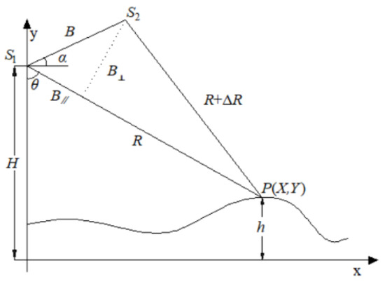 To generate an interferogram using two-pass differential interference, it is necessary to use SAR images in both snow-free and snow periods in the same area as the master and slave interferometric images, respectively. That is, let Z(M) = {Zi(M), i = 1, …, N} and Z(S) = {Zi(S), i = 1, …, N} for the master (snow-free) and slave (snow) SAR images, respectively, where i is the pixel index, N is the number of pixels, Zi(M) = Ai(M)exp(jφi(M)) and Zi(S) = Ai(S)exp(jφi(S)) are complex signals of pixel i in the master and slave images, respectively, Ai(M) and Ai(S) are the signal modulus values, respectively, and φi(M) and φi(S) are signal phase values, which are related to the signal path and random phases caused by different scattering characteristics. Figure 2 shows the master–slave SAR image interference geometry, where R is the distance from the ground point P to the master satellite antenna S1, R+ΔR is the distance from the ground point P to the slave satellite antenna S2, and ΔR is the slant distance of the two paths.