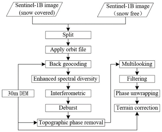 In order to obtain the local incident angle and the phase information after phase unwrapping, this experiment uses the SAR image processing software SNAP (http://step.esa.int/main/download/snap-download/, accessed on 14 January 2021) developed by ESA to process Sentinel-1 data with two-pass differential interferometry. In the experiment, the master and slave images are set as SAR images obtained during snow-free and snow-covered periods in Jiagedaqi area, respectively. Figure 7 shows the flow chart for obtaining initial data.