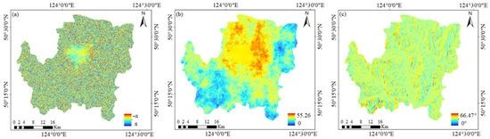 Orbit corrections can effectively avoid systematic errors caused by orbit factors. For image registration, the resampling method is based on bilinear interpolation, and by enhancing the spectral diversity, offset correction of the range and azimuth directions is performed on the slave band. The interferogram is obtained by multiplying the conjugate of the complex values of the master and slave images, as shown in Figure 8a; the topographic phase is removed from the interferogram for phase flattening. Using Goldstein phase filtering can greatly reduce the residual error in subsequent processing and improve the phase unwrapping accuracy. In the Linux environment, the phase unwrapping after filtering was performed with the statistical cost network flow algorithm Snaphu; the statistical cost mode is Differential Interferometry (DEFO), and the network flow generation method is Minimum Cost Flow (MCF). The phase unwrapping results are shown in Figure 8b. If the phase unwrapping is performed in the Windows environment, Snaphu needs to be invoked through PowerShell. For range Doppler terrain correction of the image used in this paper, the pixel spacing was set to 30 m, the reference system was WGS84, the map projection was UTM 51N and the resampling method was based on bilinear interpolation. The obtained local incident angle information is shown in Figure 8c.