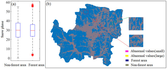 Snow phase analysis before correction: (a) snow phase box-plot diagram, there is no abnormal value in non-forest areas, while a snow phase in forest areas larger than 54.8 is recognized as a large abnormal value, and less than 4.38 as a small abnormal value; (b) distribution of abnormal values of snow phase in forest area, the red boxes show the location of large abnormal values, and the green box is small abnormal values.
