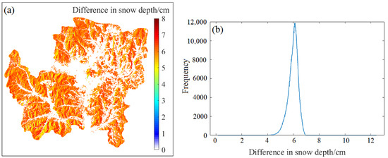 Figure 14a shows the snow depth difference map obtained by subtracting the snow depth values for the forest area estimated with and without the forest phase (that is, the traditional algorithm without considering the influence of forest is used to retrieve snow depth), and Figure 14b is the frequency distribution histogram of the difference. From Figure 14b, it can be seen that the differences are positive and mainly distributed between 4 and 8 cm, with an average value of 5.98 cm. The introduction of the forest phase increases the estimated snow depth values in the forest area. From the comparison of the average snow depth of the whole study area, the average snow depth without the introduction of the forest phase is 77.13 cm, the average snow depth with the introduction of the forest phase is 80.27 cm, and the reference average snow depth value is 84.19 cm. The introduction of the forest phase provides a new method for snow depth inversion in forest area.