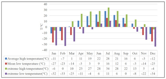 Monthly temperature data of Jiagedaqi area in 2020. Source: (https://tianqi.com/, accessed on 3 January 2022).