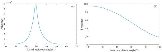 Analysis of local incident angle: (a) histogram of local incident angle frequency distribution; (b) relationship between local incident angle and snow depth.